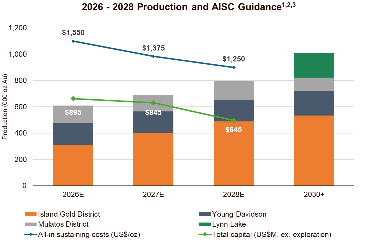 • Sustaining capital guidance of $193 to $220 million: up from 2025 and previous guidance reflecting increased tailings capital at the Island Gold District in support of the larger expansion as mining rates increase, as well as timing of capital expenditures at Young-Davidson. A further increase is expected in 2027 and 2028 supporting growing production within the expanded Island Gold District