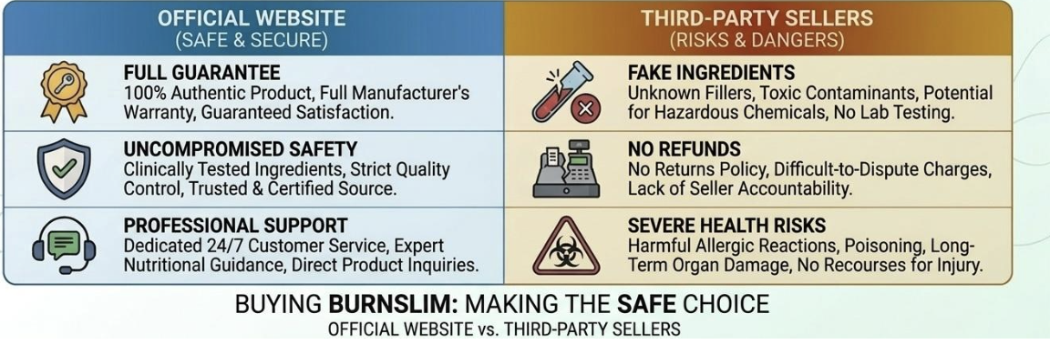 Direct Answer: Purchasing Burn Slim from third-party retailers exposes you to the severe risk of receiving tainted, counterfeit supplements. These fake products often contain incorrect dosages, harmful undeclared fillers, or expired materials. Furthermore, buying from unauthorized sellers voids the manufacturer’s 60-day satisfaction guarantee and leaves you without any customer support.