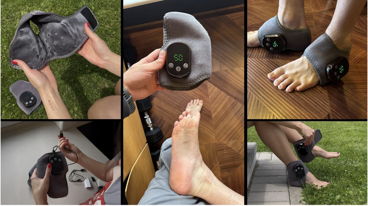 The EMSense Foot Massager is a wearable, wrap-style foot therapy device designed for at-home use. It combines three therapeutic modalities, namely heat therapy, targeted massage, and compression, into a single cordless device that wraps around each foot and ankle.