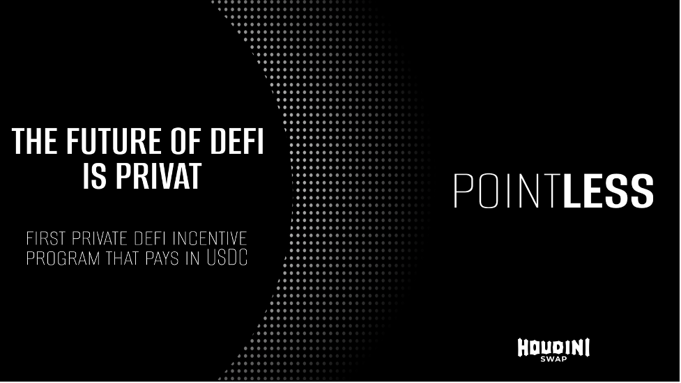 BUDAPEST, Hungary, Oct. 07, 2025 (GLOBE NEWSWIRE) — HoudiniSwap, a pioneer in private cross-chain swaps, has announced the launch of POINTLESS, the first private incentive program in DeFi. Unlike traditional rewards schemes that rely on points, governance tokens, or complex unlock schedules, POINTLESS directly rewards users with real USDC generated from aggregator revenue.