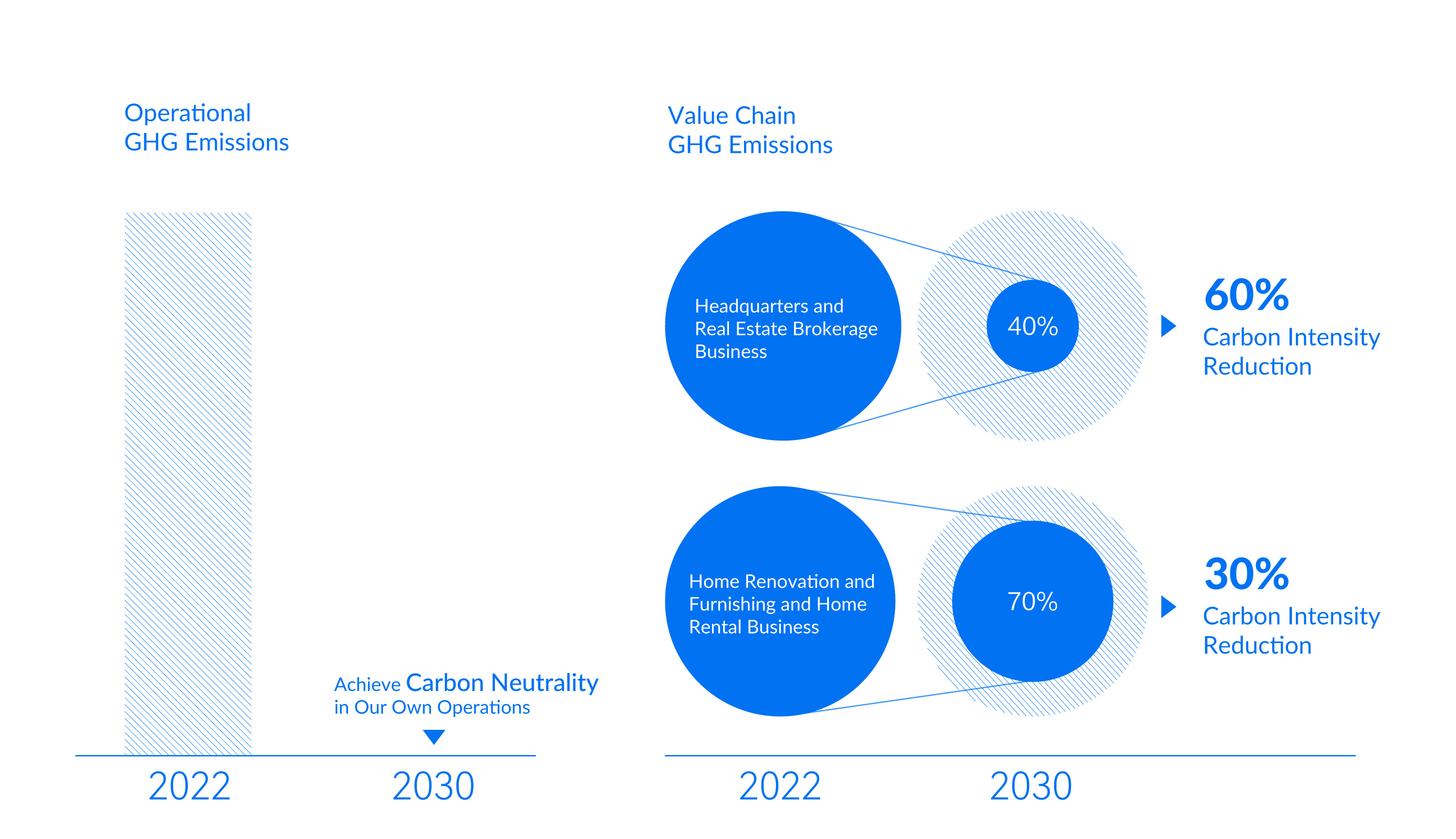 Alongside Beike’s commitments in the Report to achieving carbon neutrality in its own operations (Scope 1 and 2)1 by 2030, the Company also targets a 60% reduction in value chain carbon emissions (Scope 3)2 intensity at its headquarters and the real estate brokerage business and a 30% reduction in its home renovation and furnishing and home rental businesses, using 2022 as the base year.