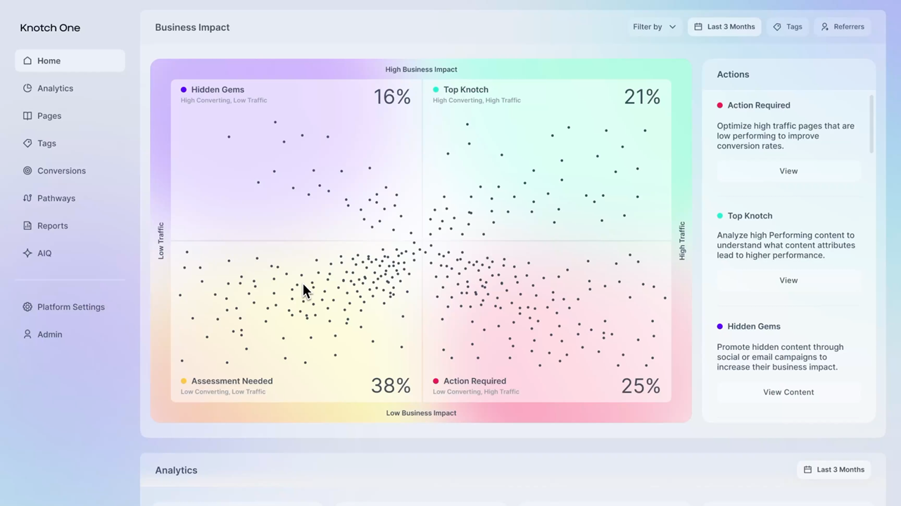 Knotch One is built on the foundation of measuring performance by collecting data across the entire audience journey. The platform captures content attributes across a web page such as engagement metrics including traffic, time spent and scroll depth, and layers in multi-session customer journey tracking and sentiment analysis. With content ingested and reviewed, Knotch One evaluates against specific business goals whether upper funnel brand building, SEO, website optimization, demand generation, or everything in between. Then Knotch One provides insights into what actions can be taken to improve performance and uses AI to assist in optimizing existing content, generating versions of content, and creating new content – all with performance at its core.