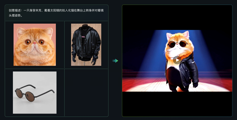 The “multi-image reference” feature is now available to users worldwide through the Kling AI 1.6 model. Users can upload one or more images of the same subject (such as a person, animal, movie character or object), and the model will reference these images to generate a video with a consistent style, ensuring the subject remains visually consistent across multiple scenes. For example, by uploading images of a cat, a jacket, and sunglasses and entering a prompt like “A humanoid cat in a jacket and sunglasses turns on stage and poses for the camera,” the model skillfully blends the reference images and user instructions to produce a professional-grade video.