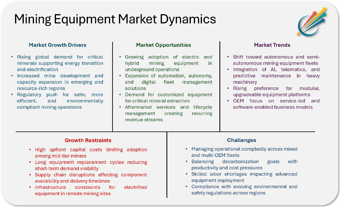 Industry dynamics are shifting as mining companies are prioritizing operational efficiency and emissions reduction. Regulatory pressure around decarbonization and mine-site sustainability is accelerating adoption of electric and hybrid equipment, while capital intensity requirement is pushing OEMs towards modular platforms and service-led revenue models. Hence, mining equipment is being positioned as a strategic enabler of long-term resource security rather than a cyclical capital good.