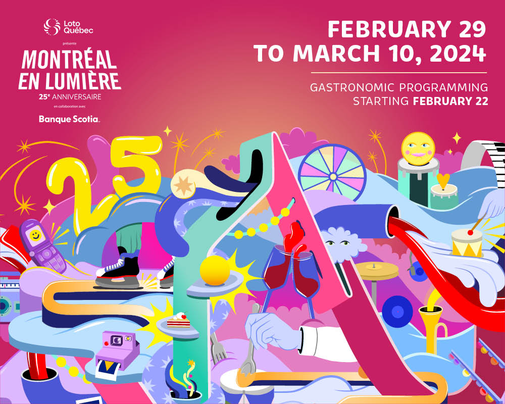 The 25th anniversary of MONTRÉAL EN LUMIÈRE will take place from February 29 to March 10, 2024 (gastronomic programming starting February 22) in the Quartier des Spectacles.