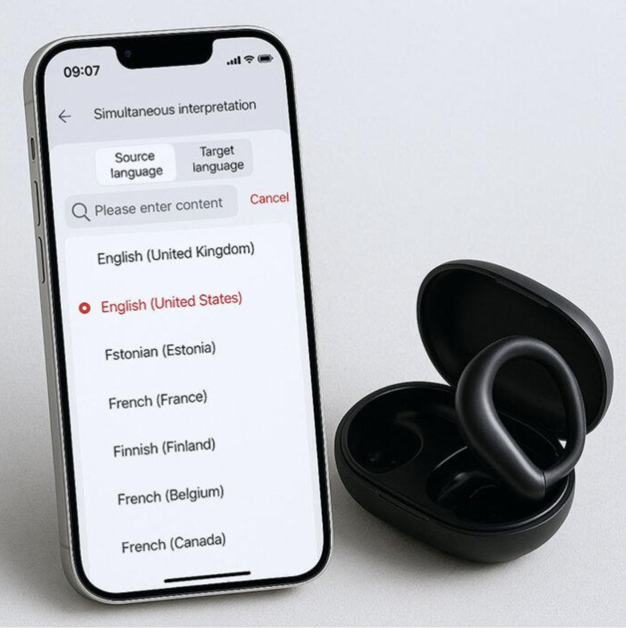 The arrangement simultaneously addresses both sides of a dialogue. Through the earbuds, the wearer hears the entering language converted into their mother tongue. Whichever audio transmission method is in use, their conversation partner hears the outgoing translation. No one has to read from a screen or hold up a phone. The technology works between the two parties rather than in front of them during the face-to-face encounter.