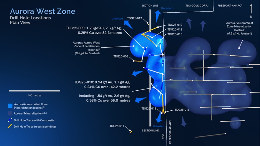 This new interval has expanded the Aurora West Zone mineralization an additional 50 metres west, for a total of 150 metres west of the property boundary and ~50 metres down dip of previously reported Phase I drill hole TDG25-003 which intersected 1.13 g/t Au, 2.6 g/t Ag, 0.30% Cu over 60.1 m (news release dated Oct 15, 2025). This area remains untested by drilling both to the west as well as down dip. (Figures 1 & 2).