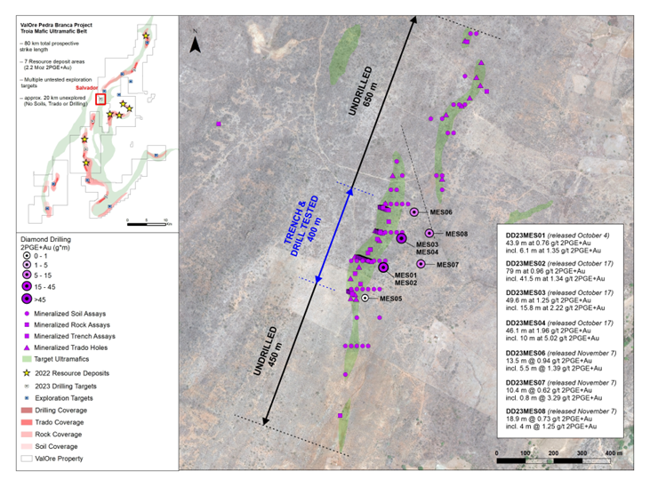 - October 4, 2023: ValOre Assays Confirm Palladium-Platinum Discovery at Salvador Target, Pedra Branca Project: 43.85 m at 0.76 g/t 2PGE+Au starting from 45.25 m, incl. 10.85 m at 1.19 g/t 2PGE+Au from 51.3 m;